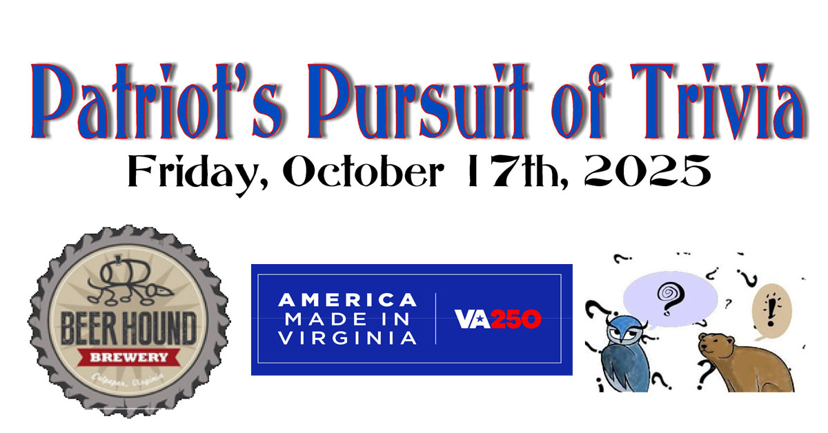 Sponsored by Beer Hound Brewery and hosted by Bear and Blue Trivia. Test your knowledge of Culpeper Histiry, Colonial Times, and the American Revolution.